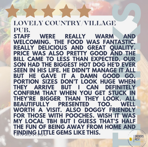 The Drovers Rest: Dogs welcome inside. Lead on and keep them close by, especially if the pub is busy.
